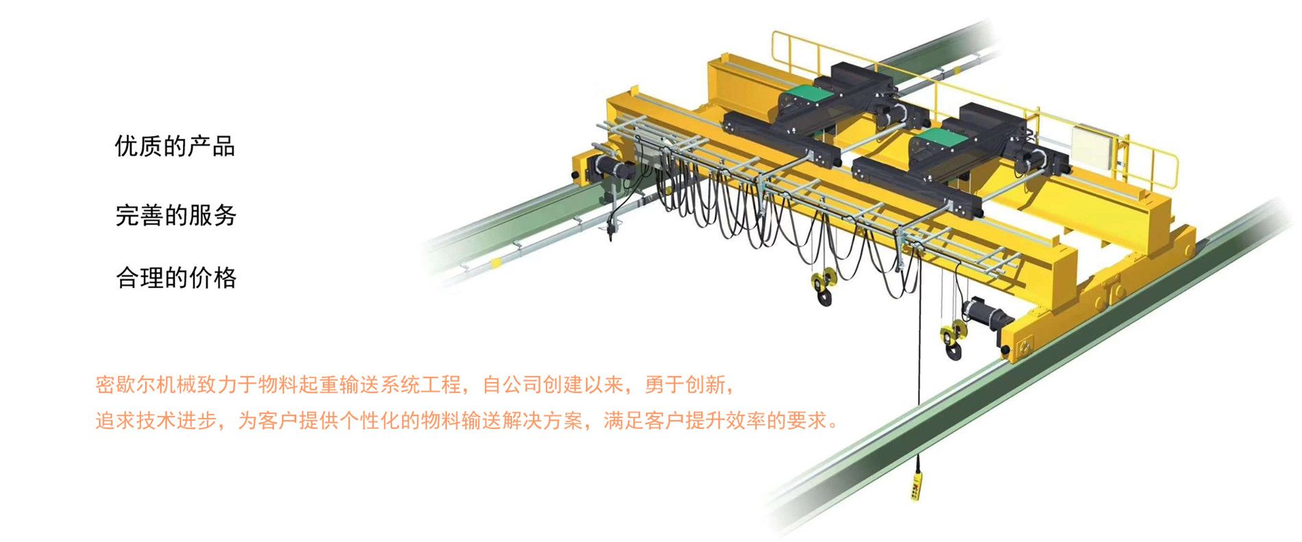 密歇爾起重機(jī)械(杭州)有限公司提供全面的起重輸送產(chǎn)品和服務(wù),產(chǎn)品覆蓋環(huán)鏈電動(dòng)葫蘆(125Kg-80T),歐式鋼絲繩葫蘆,防爆葫蘆,懸臂吊,KBK柔性起重機(jī),歐式起重機(jī),起重馬達(dá),端梁,起重移動(dòng)供電系統(tǒng)等,在國(guó)內(nèi)外被廣泛的應(yīng)用于生產(chǎn)車間,汽車,模具,機(jī)械制造,鐵路,船舶,物流搬運(yùn),現(xiàn)代化工廠流水線等工業(yè)及其它特殊用途。